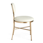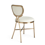 The goblet-style back and curved seat are elegantly encased in steel with a light antique brass finish. The dark caramel full-grain leather is paired with high-density foam for maximum comfort. As leather is a natural material, each piece may have subtle variations in texture and color, highlighting its individuality. The design also features plastic foot protectors to prevent damage.