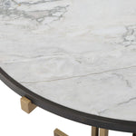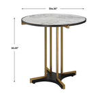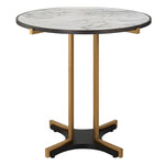 The Resplendent Table showcases a sleek Arabescato Italian white marble top with striking gray veining, finished with a honed texture. It is supported by slim, satin brass legs that feature a cantilever design, accented with brass clips. A deep black antique bronze gallery wraps around the marble, while a black powder-coated metal base adds extra stability. Versatile in its use, this table can serve as a dramatic hall table, a charming bistro table for intimate conversations, or a stunning side table when paired with a high-arm chair.