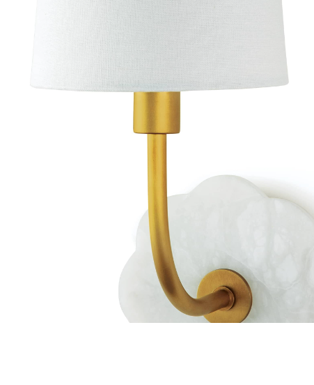 The Camilla Sconce combines alabaster and natural brass for a femininely sophisticated light. The scalloped edge of the alabaster backplate is soft and subtle, and the arm's sleek curves and long tail provide structure. Install this classic sconce in a bathroom or bedroom.