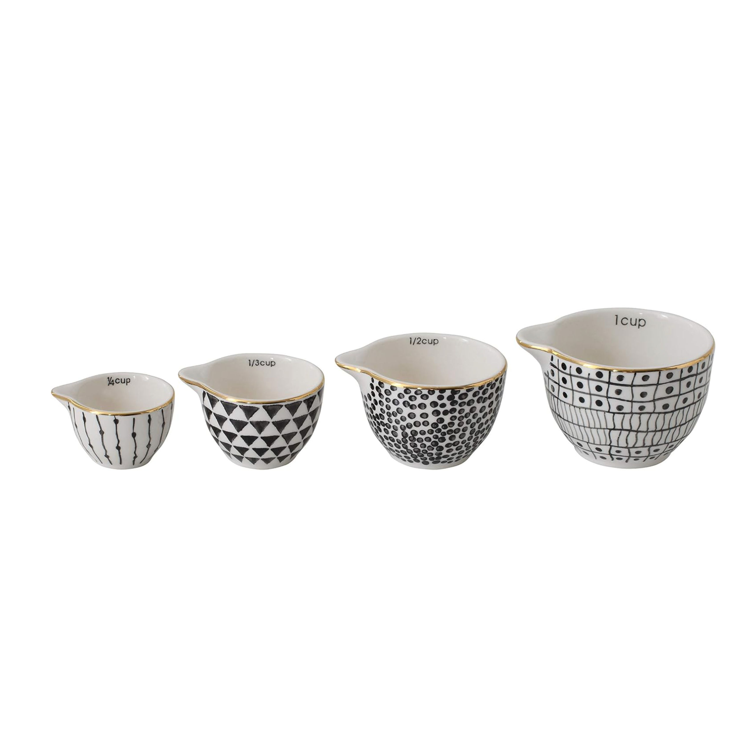 This set of four stoneware measuring cups combines function with charm, featuring a batter bowl shape, pour spout, and easy-to-read measurements. Accented with a black pattern and gold electroplating, they bring a stylish, playful touch to every baking moment.
