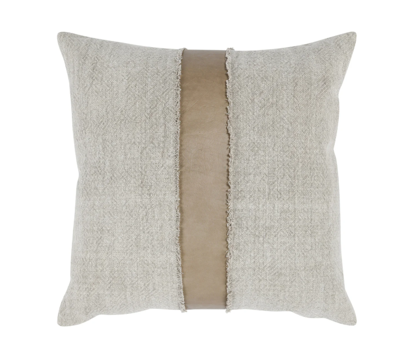 Utilizing texture and a minimalist design, this pillow creates an understated chic look that suits any decor. Warm, earthy hues complement any color scheme while the combination of linen, cotton, and leather creates subtle contrast.