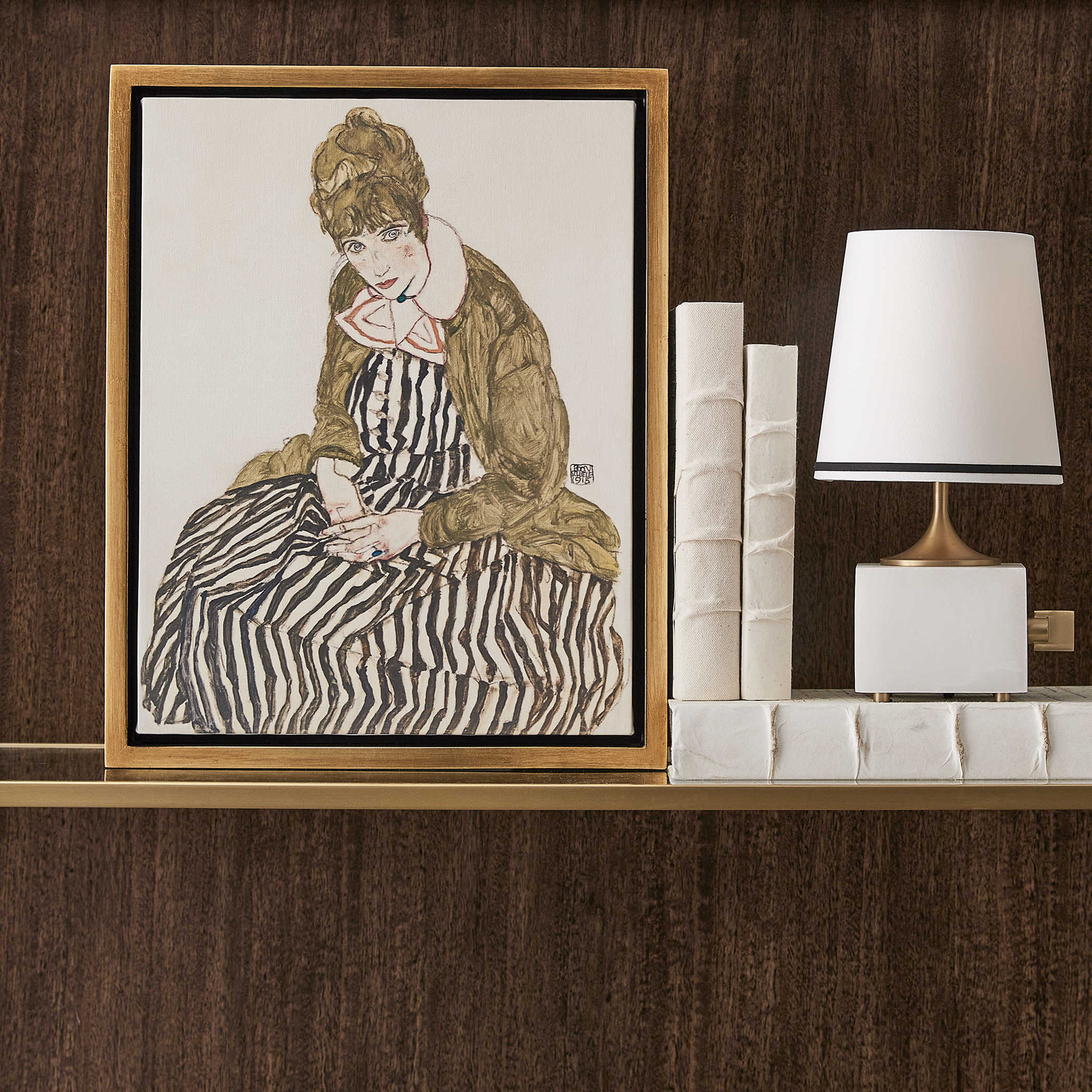 Created by Egon Schiele in 1915, the portrait of his wife, *"Edith With Striped Dress, Sitting,"* continues to captivate viewers with its striking interplay of black, white, and olive hues. This timeless piece beautifully captures the emotional intensity and bold style characteristic of Schiele’s work. Expertly framed in a floating gallery style, it is set in a pinewood frame with a gold metal leaf face and black-finished sides, adding a touch of elegance to any space. A stunning work of art that effortlessly combines history, beauty, and sophistication, perfect for enhancing your home with artistic depth.
